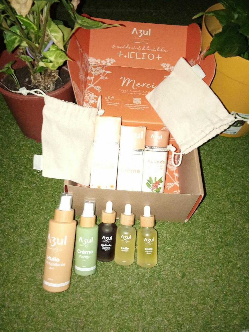 Ma commande est arrivée rapidement dans un magnifique emballage. Produits supers que j’utilise au quotidien. Ma peau est plus douce et a gagné en élasticité. Surprise: 2 flacons huile d amande douce et de ricin en cadeau.