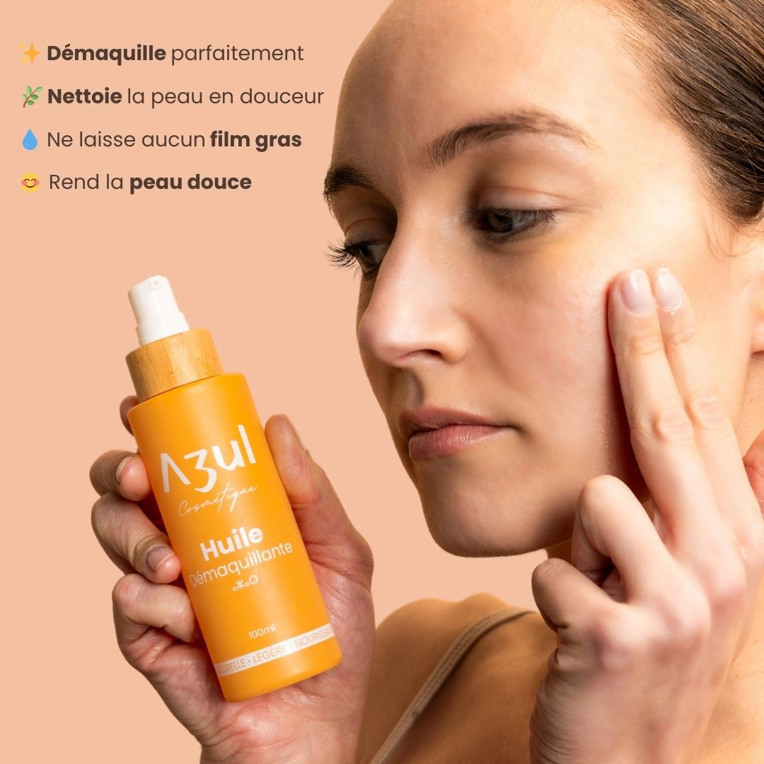 Huile Démaquillante Azar : Un mélange d'huiles végétales nobles qui se transforme en lait au contact de l'eau. Nettoie et nourrit en un seul geste.